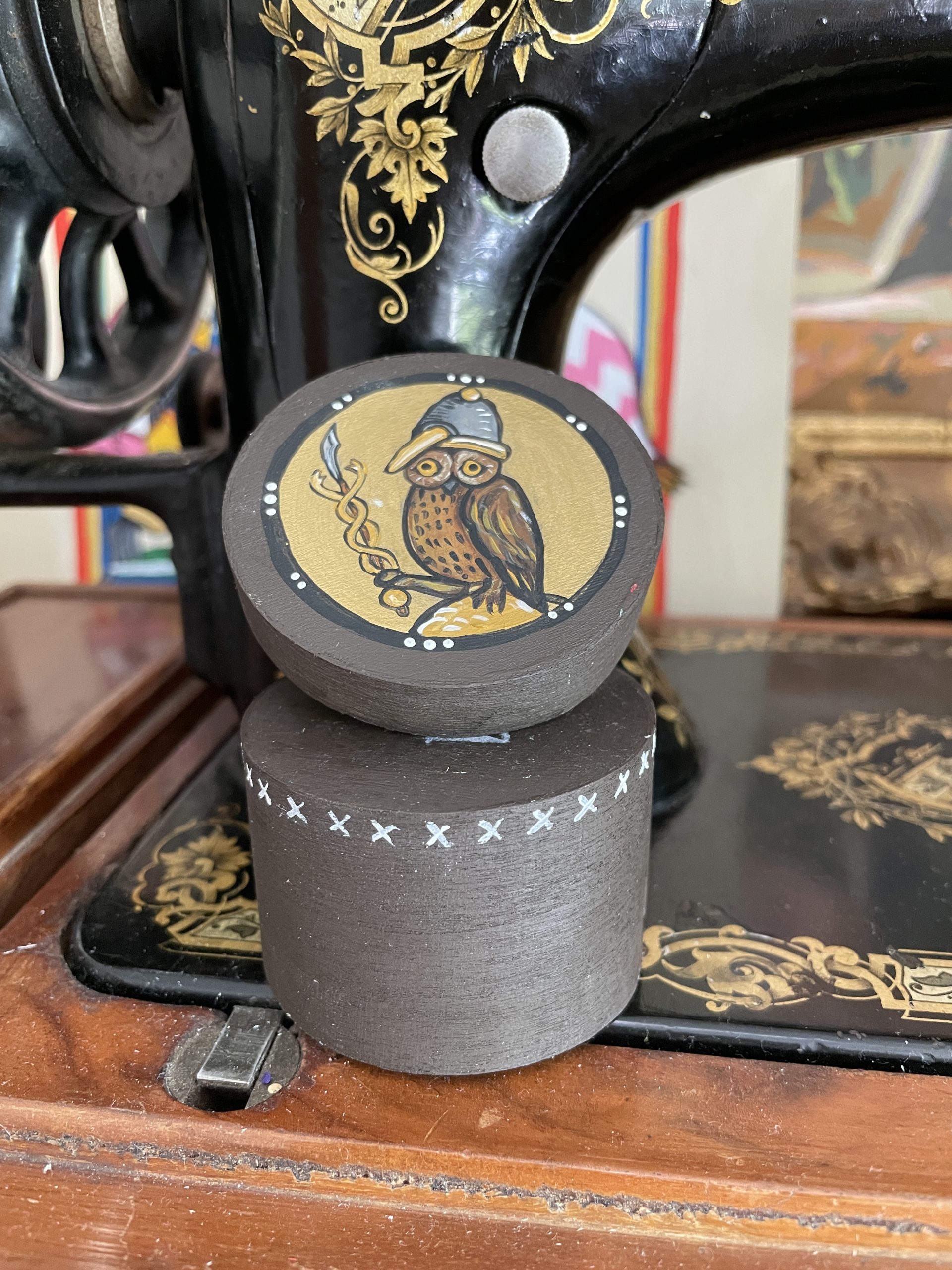 Handbemalte Spandose in verschiedenen Größen. Motiv: Eule mit Speer Acryl auf Holz